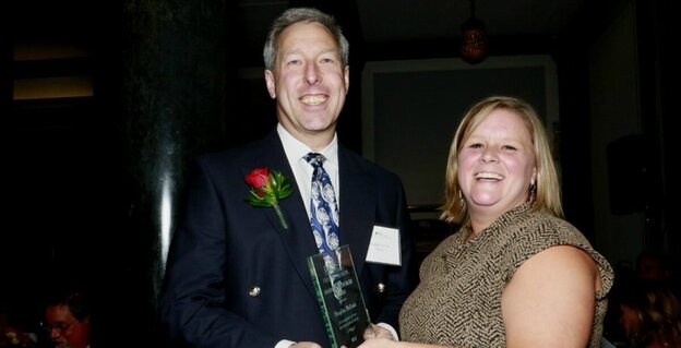 Sara Augspurger presents the 2015 Owen B. Augspurger Award to Executive Editor Douglas DeCroix at the Buffalo History Museum's annual Red Jacket Awards Dinner, October 1, 2015.