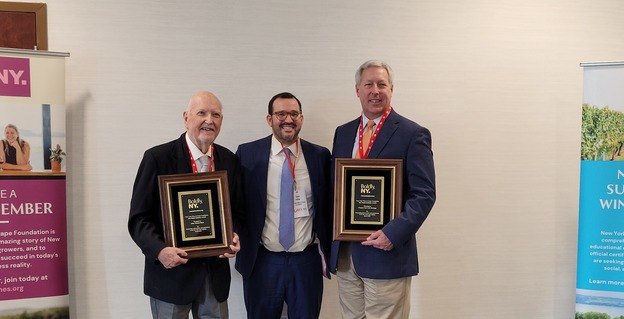 Sam Filler, Executive Director of the New York Wine & Grape Foundation (center), presents author John Thomas Slater (left) and Executive Director Douglas DeCroix (right) with the Jim Finkle Industry Award for Legends of the Chautauqua-Erie Grape Belt at their 2024 Unity Awards.
