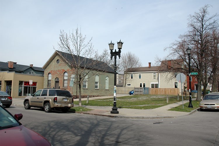 By 1996, the building was gone. Next door, as seen above, is the 1969 Society of Friends building, which the East Hamburg Society built as an urban mission. It also suffered from disuse and neglect until 2003, when the Quaker Bonnet purchased it and the building next door to operate as a restaurant and banquet facility.