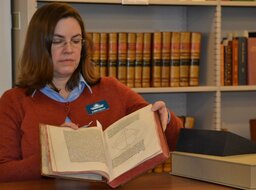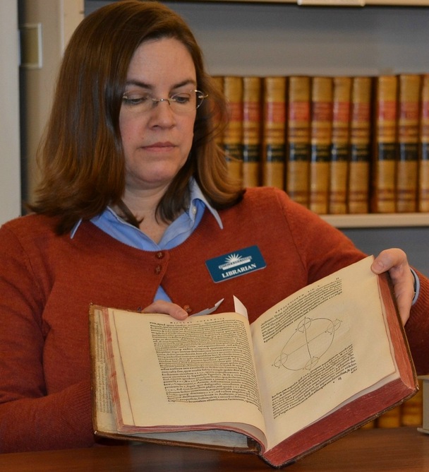 Rare books curator Amy Pickard displays De revolutionibus orbium coelestium by Copernicus (1543). This was Hamlin’s first purchase for what became the Milestones of Science collection. Copernicus’ theories so offended the Catholic Church at that time that all copies were ordered to be burned. Fortunately, this very rare copy survived.
