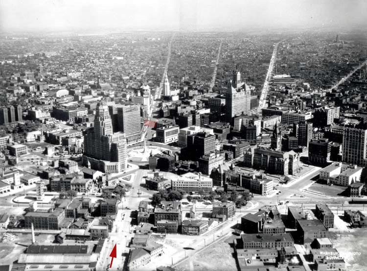 View of downtown Buffalo from August, 1936. The red arrow is set on Genesee Street. The original streets design had Genesee running from the waterfront outward past the city limits. The thoroughfare was bisected in 1976 by construction of the Buffalo Convention Center (shaded red rectangle). The street running diagonally at right is Upper Terrace Street, an area so altered in 2004 as to be difficult to compare with the images above. Note the (new) Central Terminal in the upper right corner.