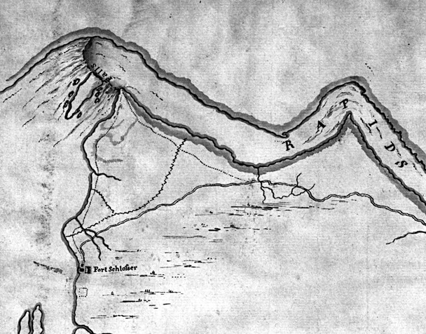 This detail from a 1788 by British engineer, Gother Mann, shows Niagara Falls, a portion of the Portage Road and the location of Fort Schlosser (at lower left). Note the dotted outline of the older French fort just below Schlosser.