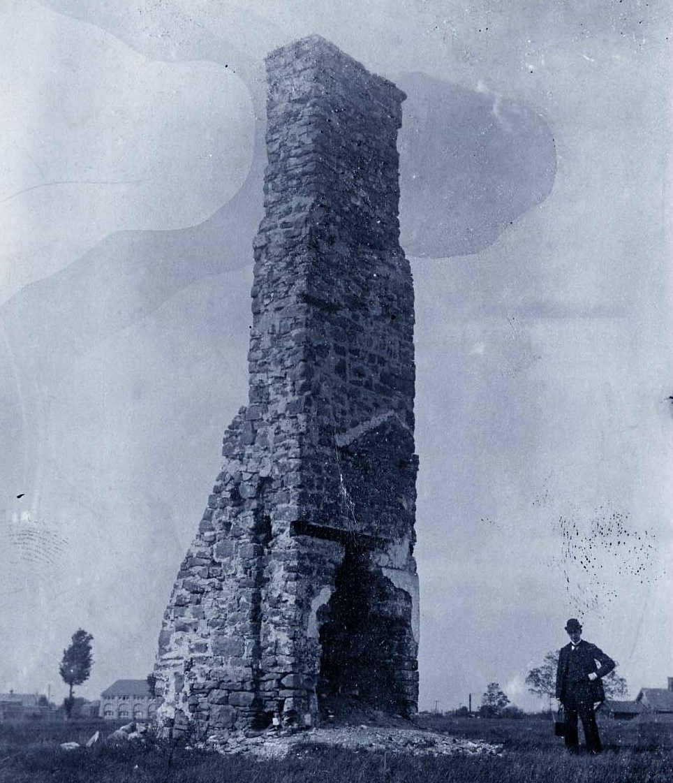 Peter A. Porter sold the old Stedman farm to the rapidly growing Niagara Falls Power Company in 1890. As it became increasingly apparent that this tangible connection to frontier and colonial history would surely be lost to the electro-industrial age, he arranged for the company to move the chimney. The structure was moved about 150 feet in 1902, though not to the spot Porter had envisioned and Olmsted had partially articulated. In fact, the move only temporarily placed it out of harm’s way. Even so, those managing the relocation process took great pains to mark and replace each exterior stone precisely. C. Breckenridge Porter oversaw this move for the Niagara Frontier Historical Society, the organization his father, the Hon. Peter A. Porter, founded in 1898.