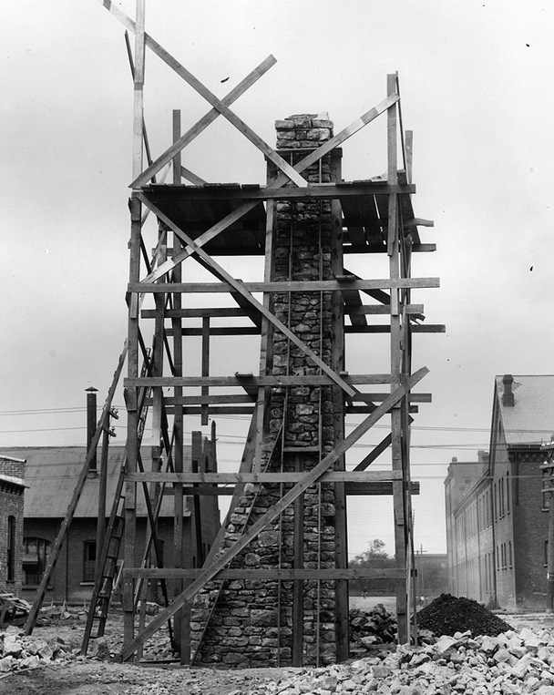 The chimney has been moved several times in its history, as part of efforts to protect this important link to Niagara’s early European history. Here a scaffold has been erected around it to allow workers to carefully number and disassemble the chimney for removal to the new Porter Park. The photo clearly shows the encroachment of the Carborundum Company in the 20th century.