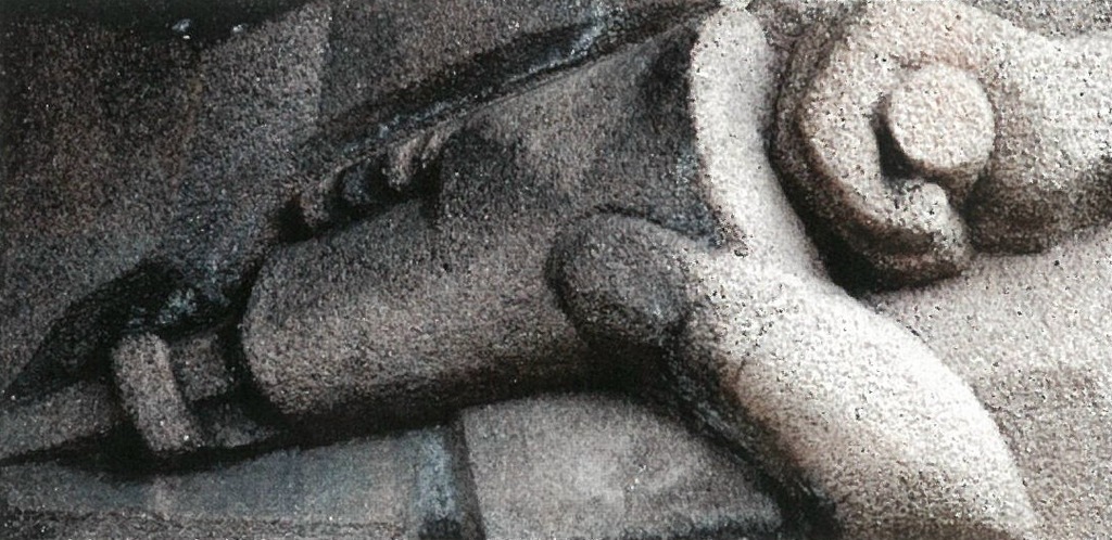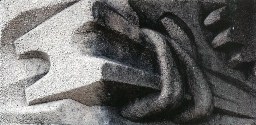 Emblems of everyday life and work included the following pairs of 1-foot-3-inch by 2-foot-5-inch cast concrete sculptures installed at entryways: