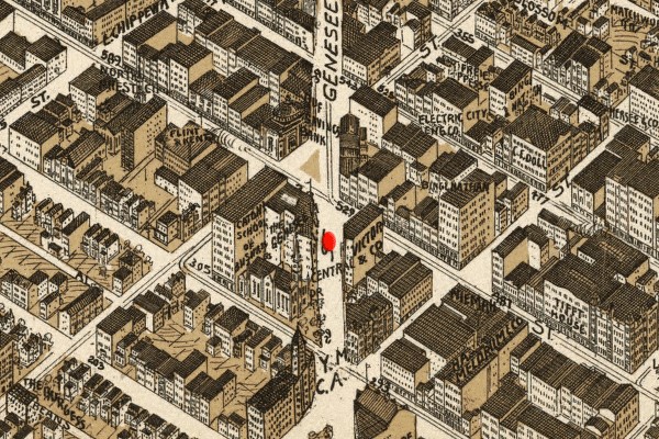 Start of parade in front of the Genesee Hotel (entrance visible at left). Buffalo Savings Bank visible beyond up Genesee Street).