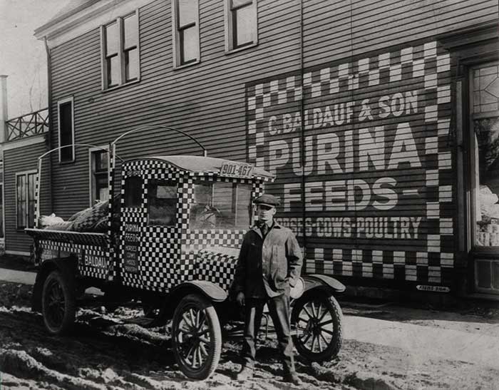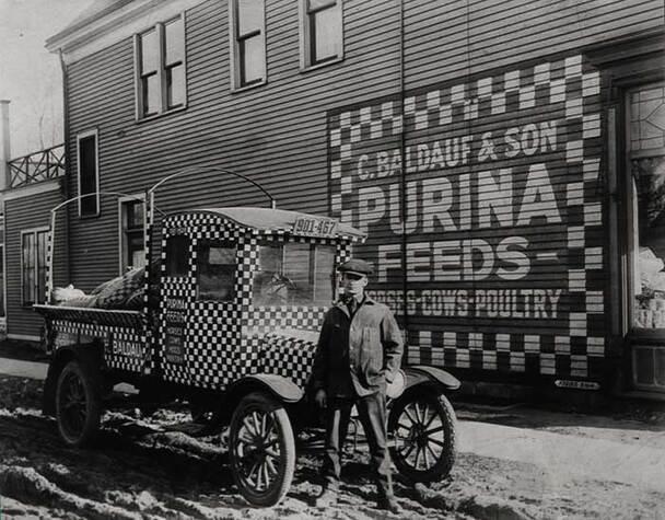 Howard Baldauf, son of the company founder, standing beside his company's Ford truck, painted undoubtedly in the red-and-white Purina trademark checkerboard pattern.