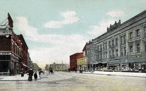 The building at right likely housed Wiesseman & Eiss Co, which specialized in dry goods, notions, men's furnishings, cloaks, furs, millinery, shoes, boys' and girls' clothing, groceries, etc.