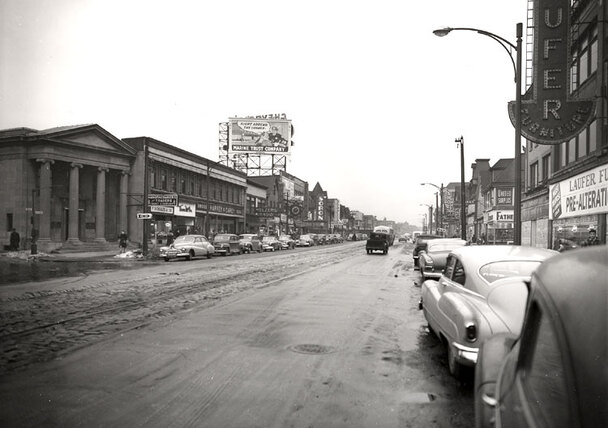 The same view in 2004. Three of the buildings visible in the 1951 photo on the left side of the street remain today. None of the buildings on the right side remain. The area has been rebuilt with stores featuring adjacent parking lots.