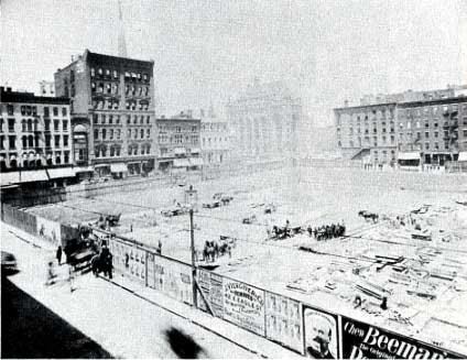 And, when they were finished demolishing an entire city block, 240 feet (Main & Washington Streets sides) by 200 feet (Swan & South Division), this is the hole that remained on May 31, 1895.
