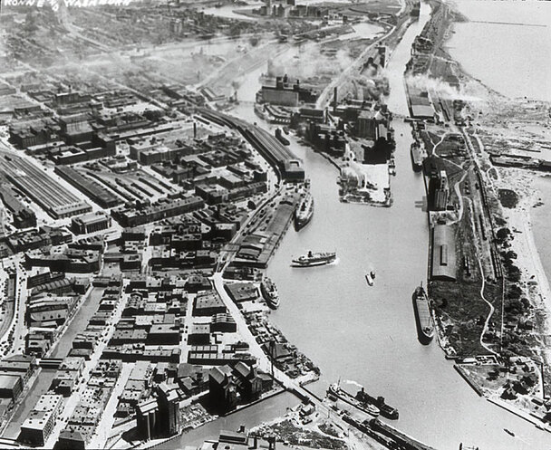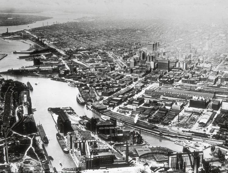 Aerial view of the Inner Harbor. The sandy-appearing area at upper right is Times Beach. In a few years (1935), it will be opened to the public for bathing.