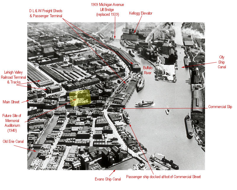 Coming in the 1930's was the construction of the Memorial Auditorium. The old Erie Canal bed and Commercial Slip would be filled in. And the "canal district," the impoverished immigrant neighborhood by the harbor with so much colorful and unlawful history will begin to be demolished completely.