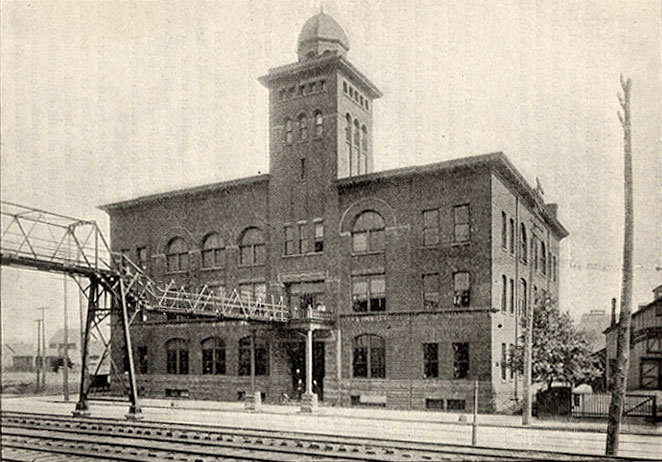 Home of the East Buffalo Live Stock Exchange Company, in 1901, at 1167 William Street, directly across from the New York Central Stock Yards. This building, designed by Louise Blanchard Bethune, was constructed in 1892, two years after the exchange was incorporated to facilitate livestock brokerage in Buffalo. Access to the livestock yards was made convenient by the bridge visible above which crossed William Street.