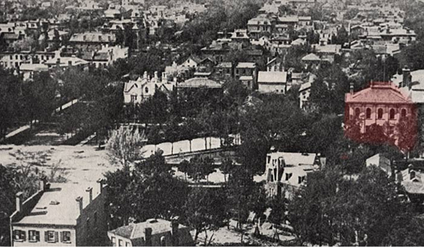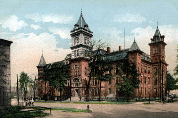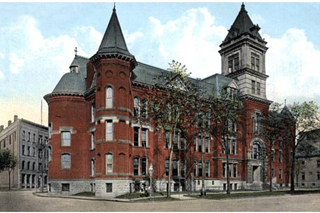 The Central High School in 1870, the undeveloped Niagara Square at left (blank space). When opened to students in 1854, the Central School (later renamed the Central High School) was the only school entirely devoted to high school classes.