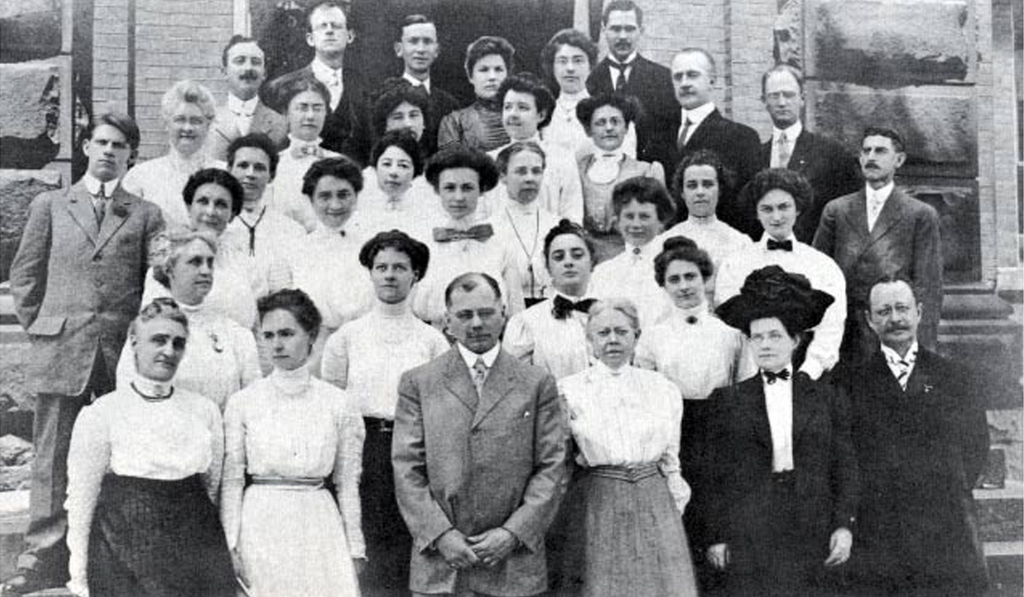 The senior class of 1891. Situated as it was along main thoroughfares made for a noisy learning environment. Said one writer, "Car tracks on all sides of this school. They are going to build a new one. So noisy that some of the teachers have to use megaphones. Honest!"The Central High faculty in 1910. The city did build a new eplacement for the old building and in 1914 opened the Hutchinson High School nearby at 256 South Elmwood. The faculty were surely thrilled with their new building.
