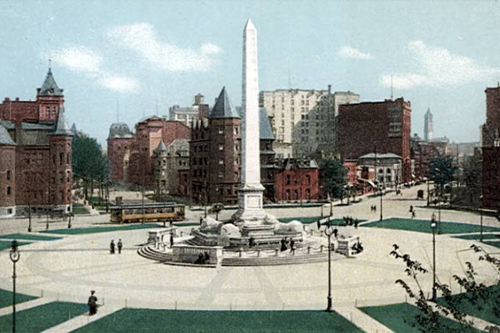 Niagara Square c. 1910 after the development of the Square and construction of the McKinley Monument (1907). Central High School is at left; across the street the Women's Christian Association Building (64 Court).