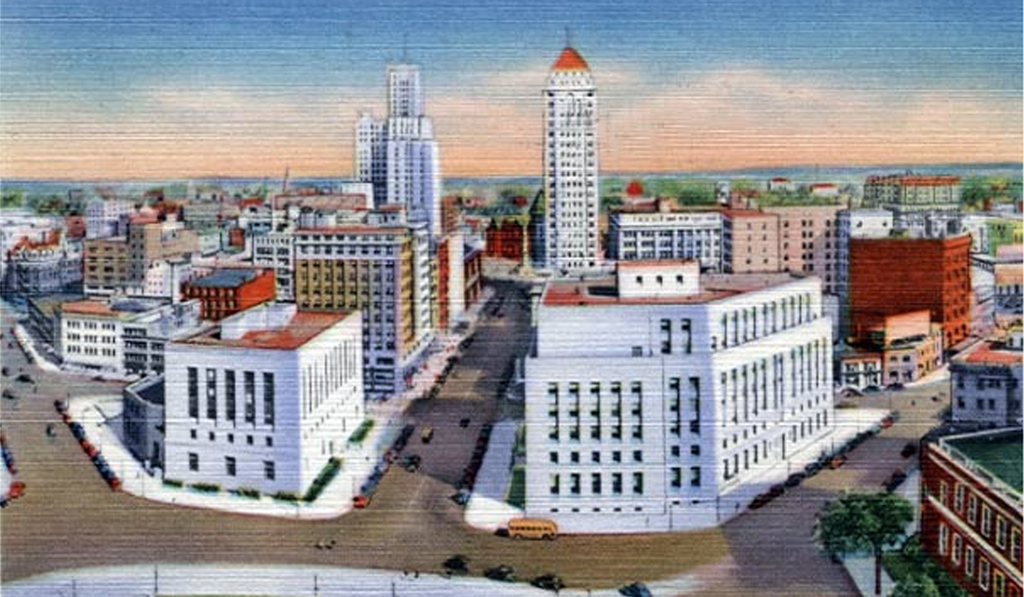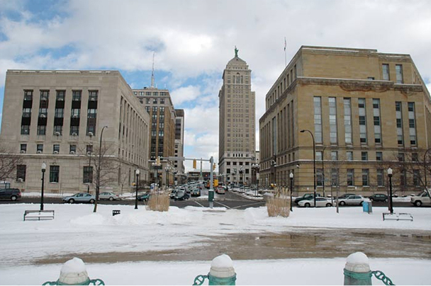 The same view in the late 1930's. In 1921, the school and land were sold to the state for $401,000, funds which the city earmarked for construction of its new city hall across Niagara Square. The old school was demolished in 1926 and the new State Office Building (now called the Mahoney Building), designed by Green & Wicks, was built on the land between 1928-1932. Its address is 65 Court Street, which runs in the center of the image above. The building across the street in place of the Women's Christian Association Building is the 1936 Federal Court House.
