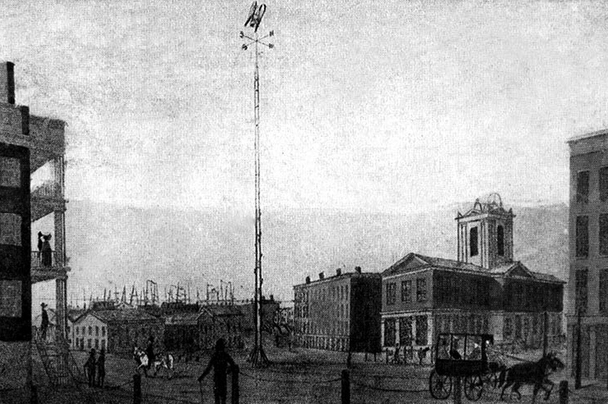 "...in 1848 the shaft was shortened to give it greater stability. In June 1860, Levi Waters made a contract with Richard Taff for the construction and erection of a new pole. John Wheedon's weather-beaten eagle was saved, minus some pinions, tail feathers and talons. The copper box showed signs of erosion.