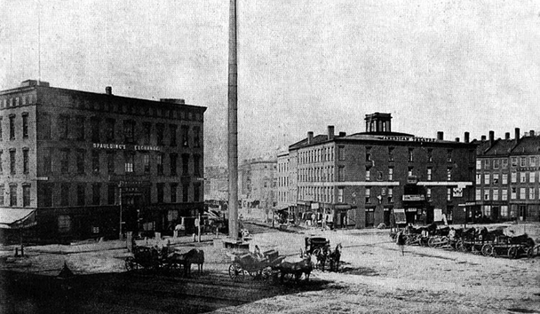 Liberty pole #2, 1866 at the same location as above. At left behind the Liberty pole is the Spaulding Exchange. Image source: Severance, Picture Book of Earlier Buffalo.