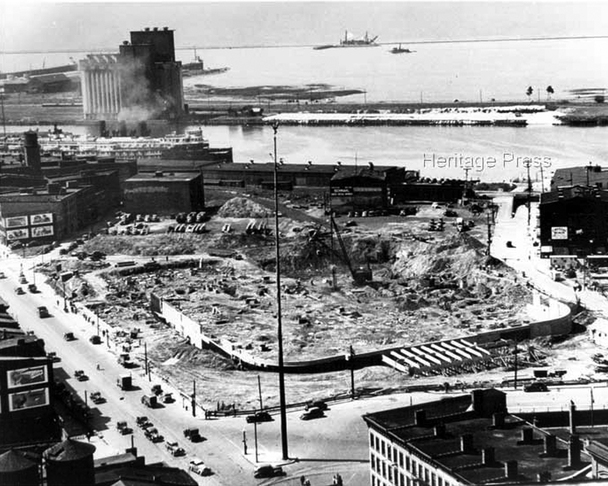 Liberty pole #4, 1939, just before it was demolished. The foundations of the Memorial Auditorium are visible behind the Liberty pole; it was constructed on the side of the Spaulding Exchange. Image source: WNY Heritage.