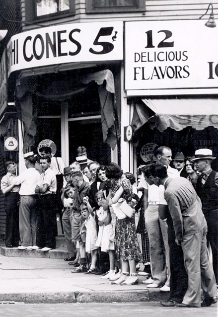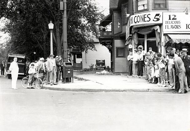 Do you think these people are in line for ice cream from Mrs. Thomas' Confectionary at Delavan & Humboldt?