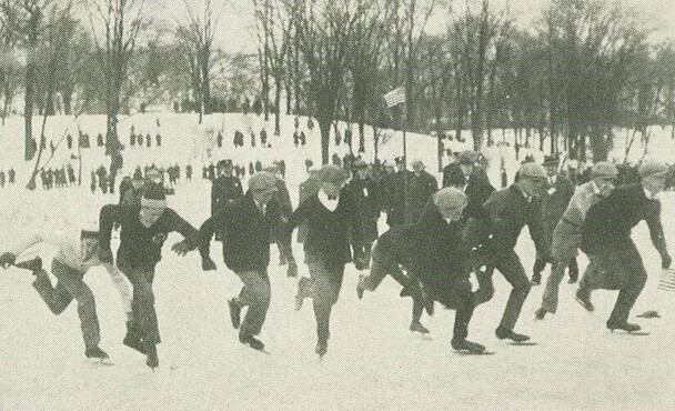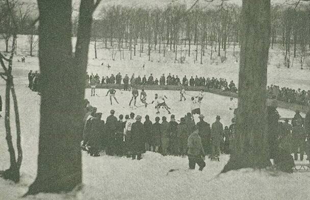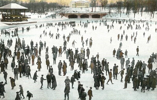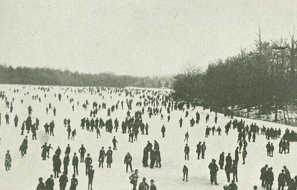 Skating on the Park Lake (Delaware Park), c. 1910. View above is from the Casino toward the Lincoln Parkway Bridge. Historical Society in the distance. Image source: private collection.