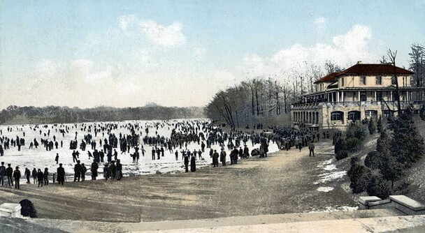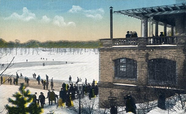 View of the frozen Park Lake (called Hoyt Lake in 2008), casino at right, c. 1910. Image source: private collection.