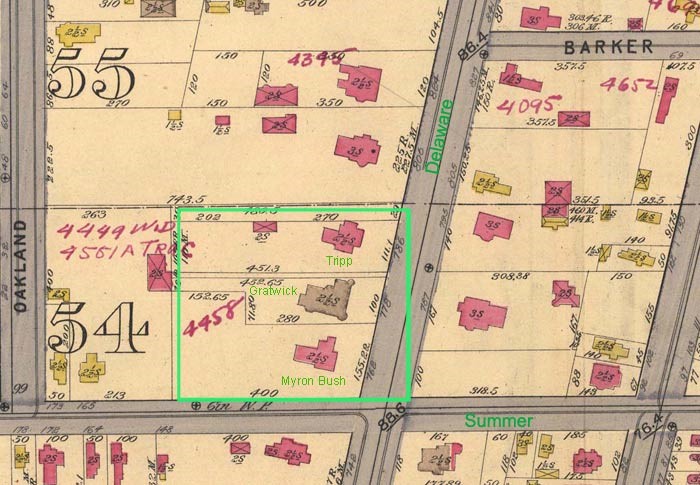 The corner of Delaware Avenue and Summer Streets saw a succession of mansion-building. Myron Bush built his mansion in 1859 at the corner, 762. In 1888, William Gratwick hired H.H. Richardson to design what would be Richardson's last building, known as the Gratwick mansion, in 1888. And after the 1850's, Erastus Prosser built his own mansion at 786 Delaware Avenue. When the 1894 atlas above was drawn, Prosser had died and Augustus Tripp owned the home.