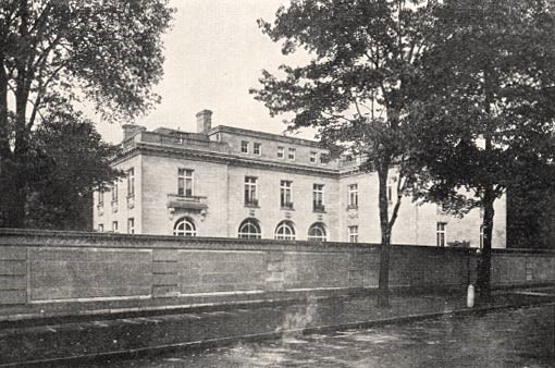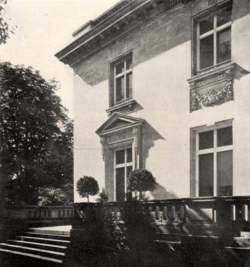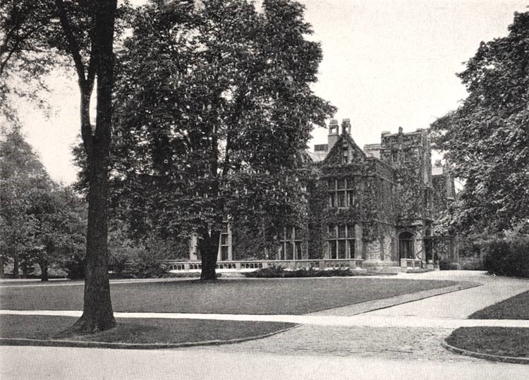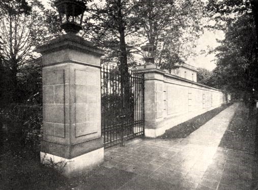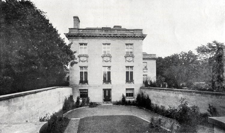 Mansion viewed from Summer Street. Garden and fountains behind the wall. Image source: private collection.