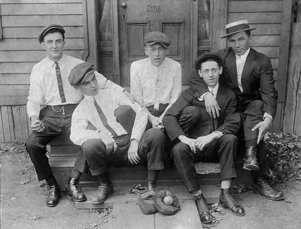 These stylishly-dressed friends gathered on the stoop of 360 Elk Street (now called South Park in this area) c. 1915 after a game of baseball; note the gloves and ball in the center at their feet. Four of the five are identified as follows: Bill Dent, Mike Scanlon, Tom Reidy, and John Collins. Notice the deep cuffs on their trousers, the very thin four-in-hand ties with tie tacks and a couple of ties with an extra button near the knot, the watch fobs, and the 1.5-inch heels on their shoes. Even their pose is artfully created, but their looks tell us they are enjoying their youth and taking none of this too seriously. They have the confidence of modern "boys in the hood."