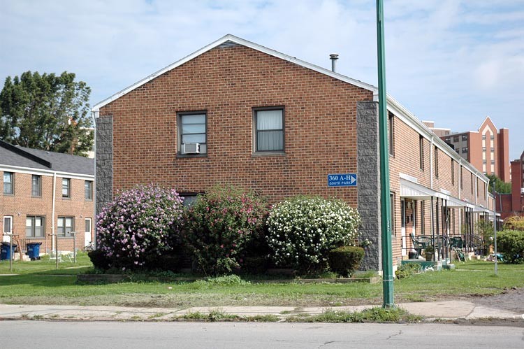 360 South Park Avenue (formerly Elk Street) in 2004. The clapboard structure behind the young men has been supplanted by these brick apartment buildings Only one or two of the residential/business structures from the early 20th century remain in this area.
