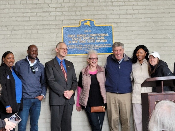 On the morning of April 20, Greg’s goal became reality, as a small, but dedicated crowd of supporters gathered at Buffalo’s Robert Rich Sr. All-High Stadium to recall the achievements of this pioneering group of women, and to unveil the historic marker. As an added bonus, representatives from Section VI’s flag football program arranged for an exhibition women’s flag football game to be played in the stadium as part of the event.