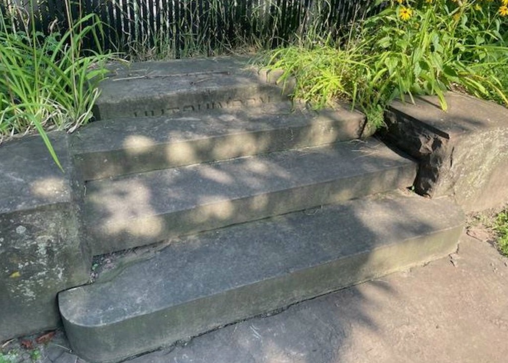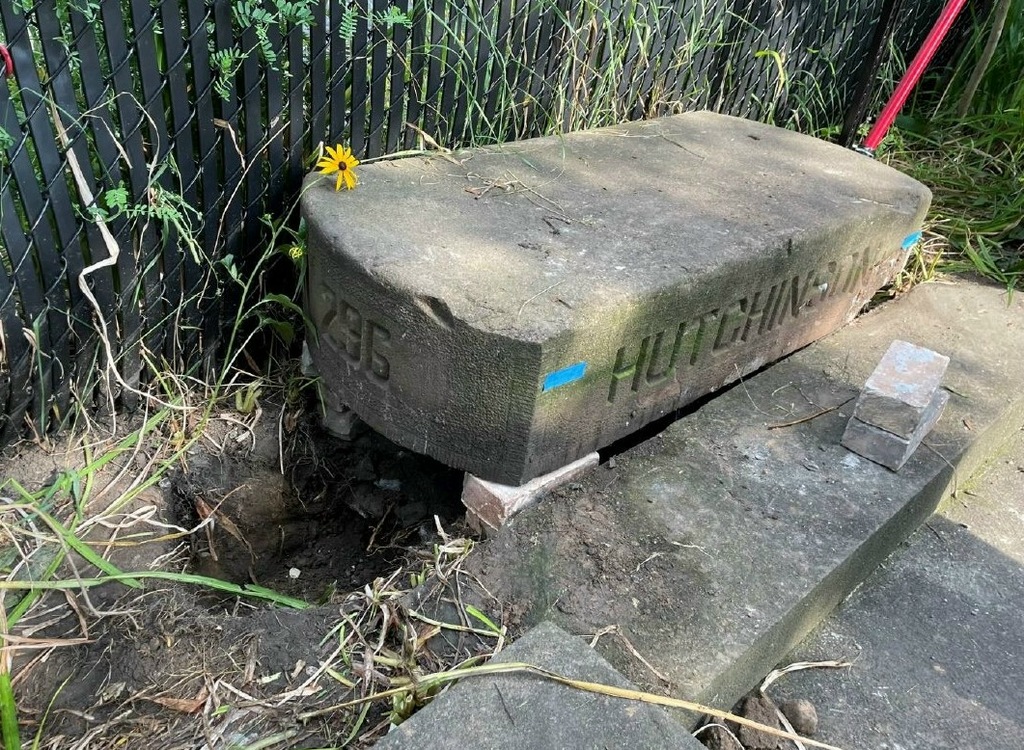 As best recollected, the stone – originally sitting street side on Linwood – was inadvertently scooped up by a city front-end loader cleaning up after a Buffalo blizzard in the 1990’s, as it was hidden in the snow. After noticing the stone was missing and inquiring where it may have been moved, it was feared dumped in Lake Erie or in the Black Rock Canal at the end of Porter Avenue, which was a common local practice. While visiting the Buffalo Central Terminal the following spring to explore potential terminal re-development plans, by which time much of the snow had melted, Tim Tielman noticed and recognized the Hutchinson stone and the address “296” etched on each end. The stone was returned to its rightful location, but rather than place it by the curb, the decision was made to set it at its now prominent spot at the top of the remaining steps. It was centered amidst the sandstone garden wall – together, the remnants of the long-gone mansion that was once home to the Hutchinson family. A missing corner of the stone at bottom front right and a smaller shaving on top is presumed to be a souvenir of its travels.