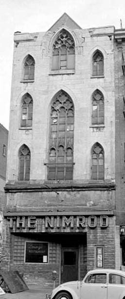 By 1967, Gothic Hall had devolved into The Nimrod, a bar. It was demolished as part of the project to build the Marine Midland now HSBC) Tower.