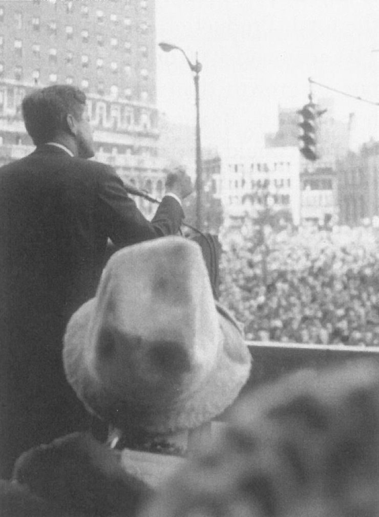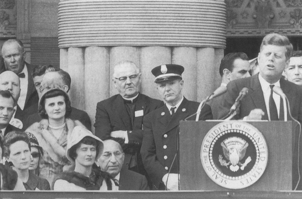 The President gives an impassioned Pulaski Day speech from the steps of Buffalo City Hall, October 1962.