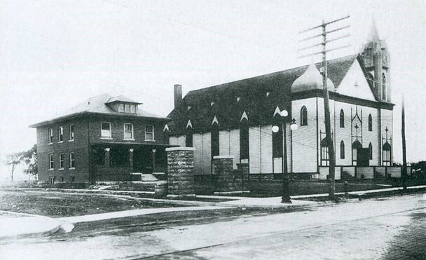 The first St. Paul's Catholic Church was constructed of wood at the corner of Victoria and Delaware in 1897. The rectory is at left.