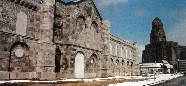 Buffalo Gas Works façade, West Genesee Street, with City Hall in background.