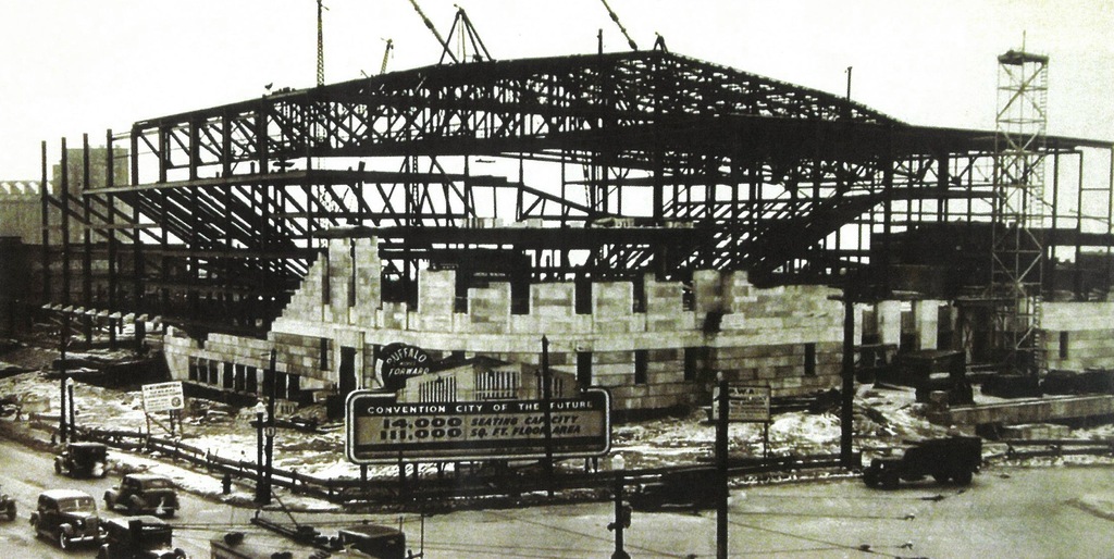 Construction on Memorial Auditorium began in November 1939 by the Works Progress Administration (WPA) and finished the next fall. The arena’s Art Deco style fit perfectly with City Hall and the Central Terminal, quickly becoming an aesthetically pleasing and functional focal point of Buffalo life. With an original capacity of 12,280 for hockey and additional floor seating for basketball, concerts, wrestling and other events, the Aud attracted over one million people in its first seven months. The AHL’s Buffalo Bisons (“Hockey Before Helmets,” Winter 2008) were the biggest attraction but the Aud hosted everything from dog shows to political rallies.