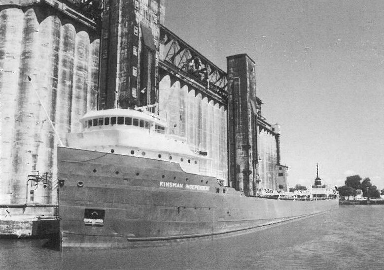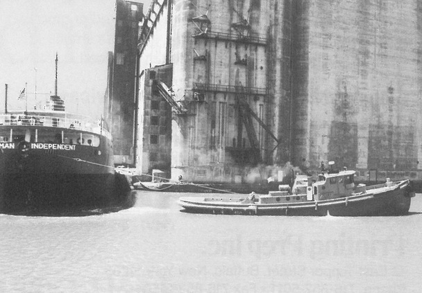 The Kinsman Independent leaving the dock at the sharp bend in the Buffalo River under tow by the Great Lakes Towing Co. tug New Jersey; to the immediate right of the tug is the long unusual flat wall facing the river.