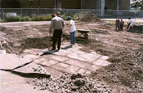 Maiden Lane paving removed for deeper site examination. This excavation was halted and the parking lot repaved.