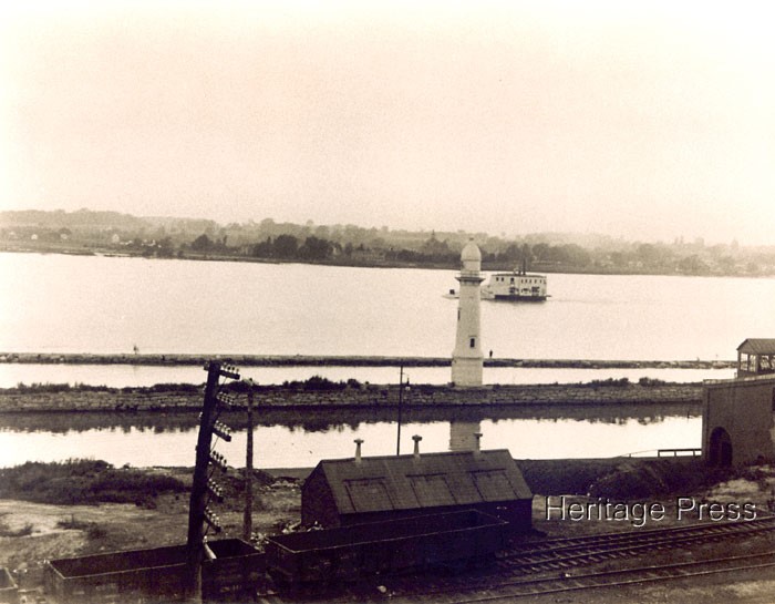 The Massachusetts Pumping Station in the Niagara River, viewed from Front Park in the 1920s. The Peace Bridge will bisect this view.