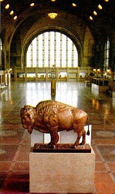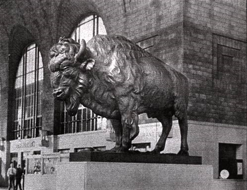 The New York Central Terminal in Buffalo, located on what is now known as Memorial Drive, opened in 1929. The terminal had no plans to include a representative buffalo, but sometime during the late 1930s or early 1940s, the Buffalo Museum of Science loaned one of its 'stuffed' buffaloes to the New York Central for display in the terminal. It proved too popular with servicemen who rubbed its nose for good luck as they departed for war and, in 1945, the Museum reclaimed its exhibit.