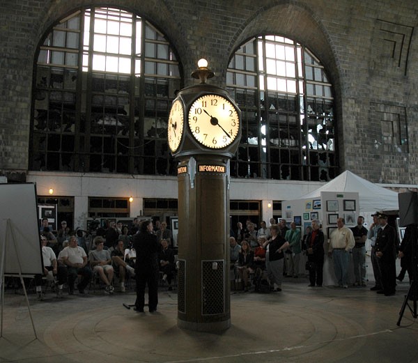 The concourse, 225 feet long, 66 feet wide, and 58.5 feet from floor to vaulted ceiling, was the most spectacular public space yet built in Buffalo. It was designed to smoothly handle 3500 passengers per hour. The architects designed the information booth and clock in the center to give the vastness a human scale. Atop the cast-iron clock was a light which, when switched on by the booth attendant, glowed green as a summons to the New York Central Police for assistance.