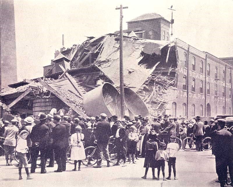 Suddenly, one of the boilers exploded. As the Express described the result: "The Three floors of the milling department of the factory, which really made up Building A, had sunk to the level of the floor of the second floor. The roof was still attached to the edge of the building of Building B and it sloped from this roof to the center of the ruin of Building A. Two monstrous vats, which had held some sort of chemical used in the manufacture of starch, had tipped out of the second floor and sagged to the sidewalk on Oneida Street."