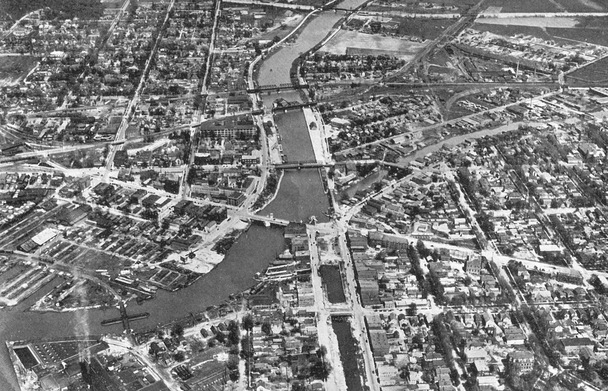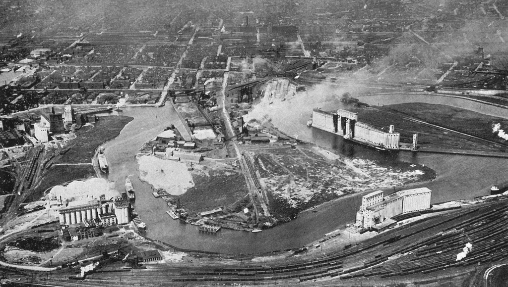 The serpentine Buffalo River creates a peninsula in the center of this view. At the right is the Concrete-Central grain elevator with three dark marine towers in the center of the elevation. At the left, the site of the Lake & Rail is vacant.