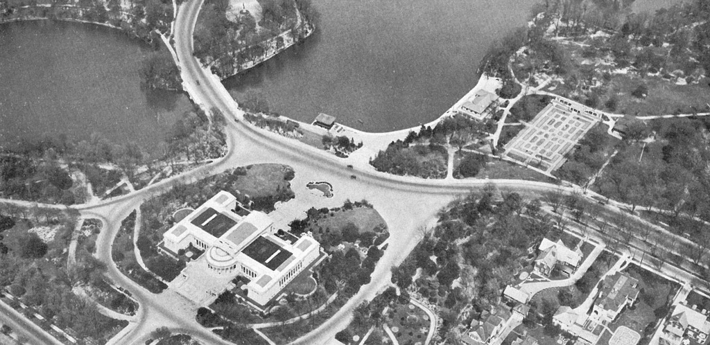 The original, formal symmetrical Albright Art Gallery facing Lincoln Parkway and Delaware Park Lake. The rose garden is fully developed adjacent to the park casino.
