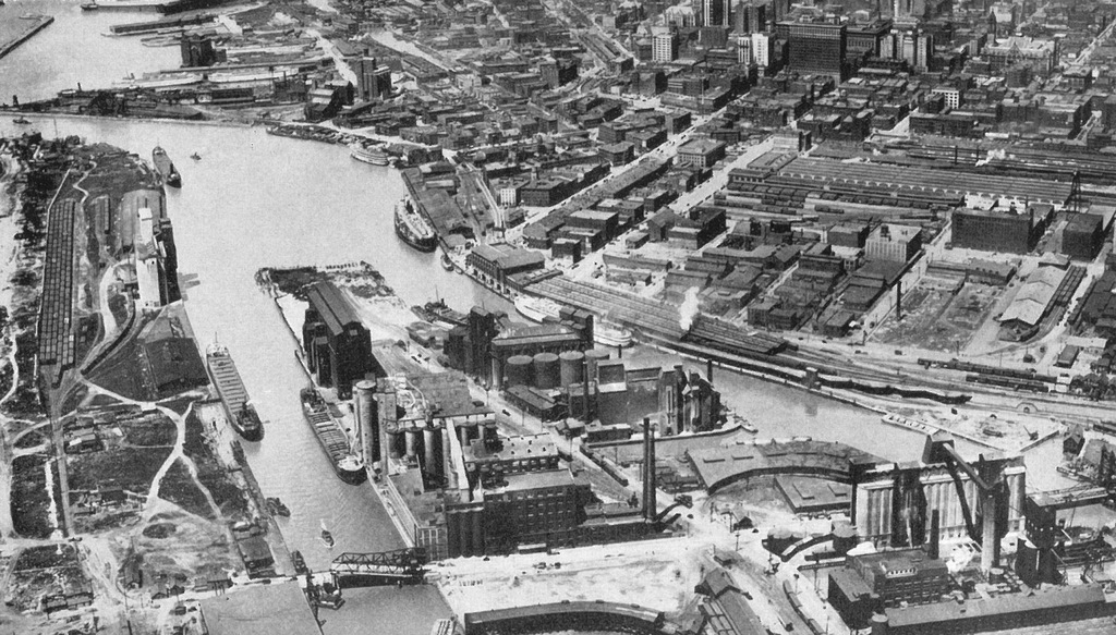 The Buffalo waterfront at the foot of Main Street. The buildings of the canal district, lower Main Street and the “Cobblestone District” are still in place. The Dakota Elevator stands near the end of the City Ship Canal. The south Michigan Street lift bridge is visible in the foreground.