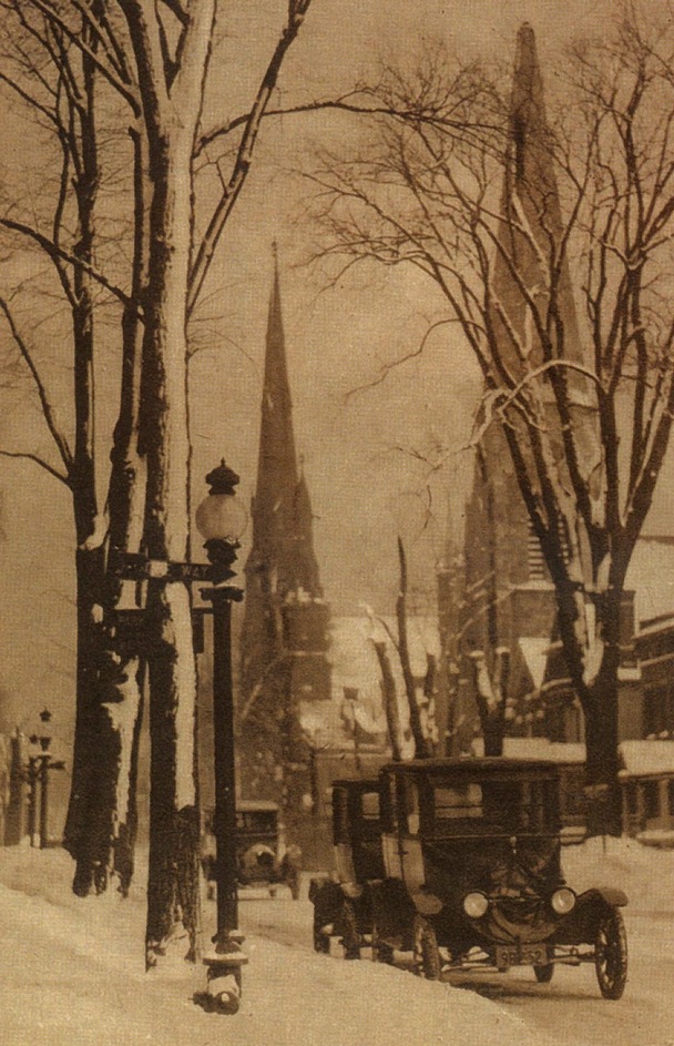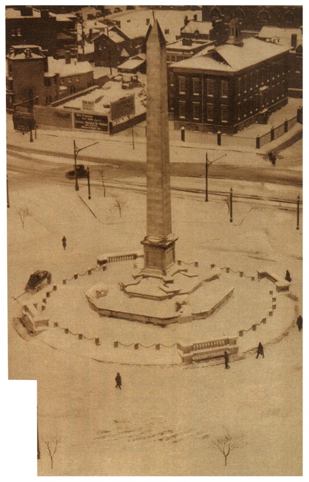 The Soliders and Sailors Monument at Lafayette Square. The Lafayette branch of the Public Library background.