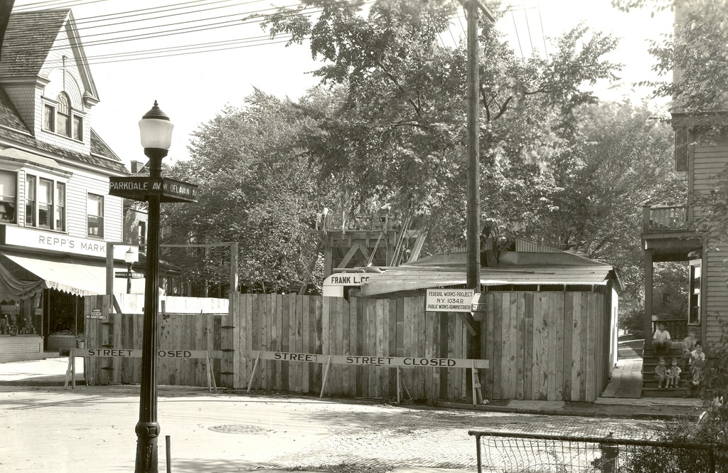 Work being done on Bailey Avenue, looking north from Seneca Street, August 5, 1937. Just visible to the left of the PWA sign is a delivery vehicle from Colonial Bakery.