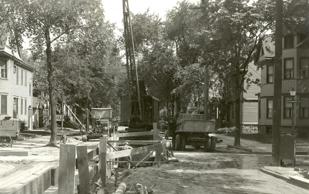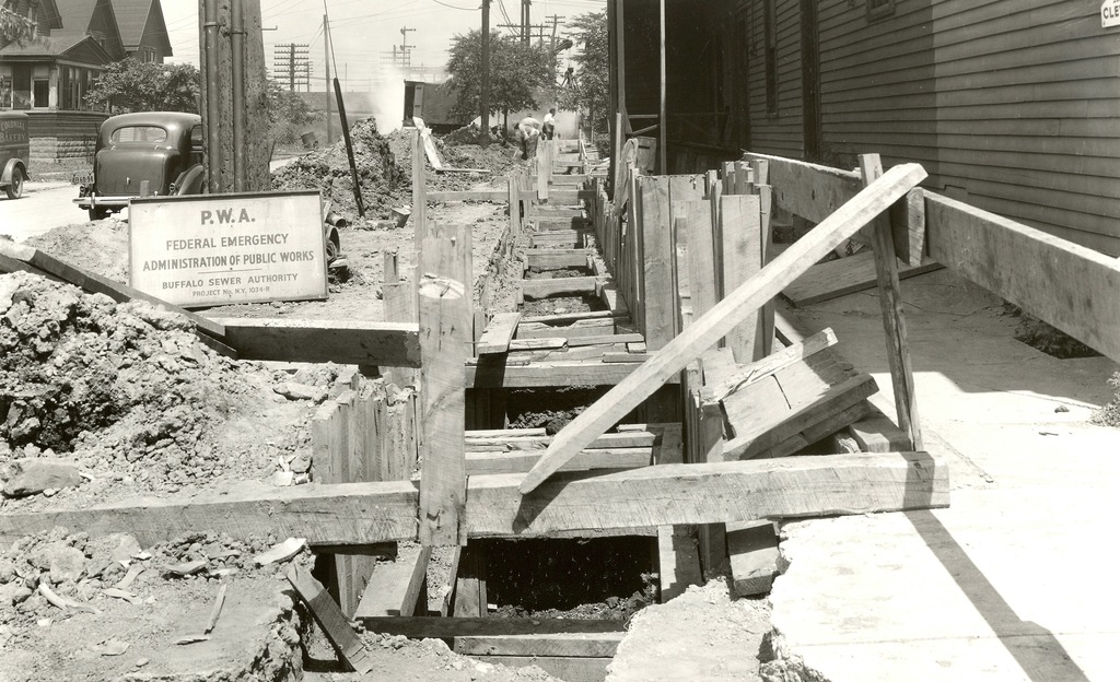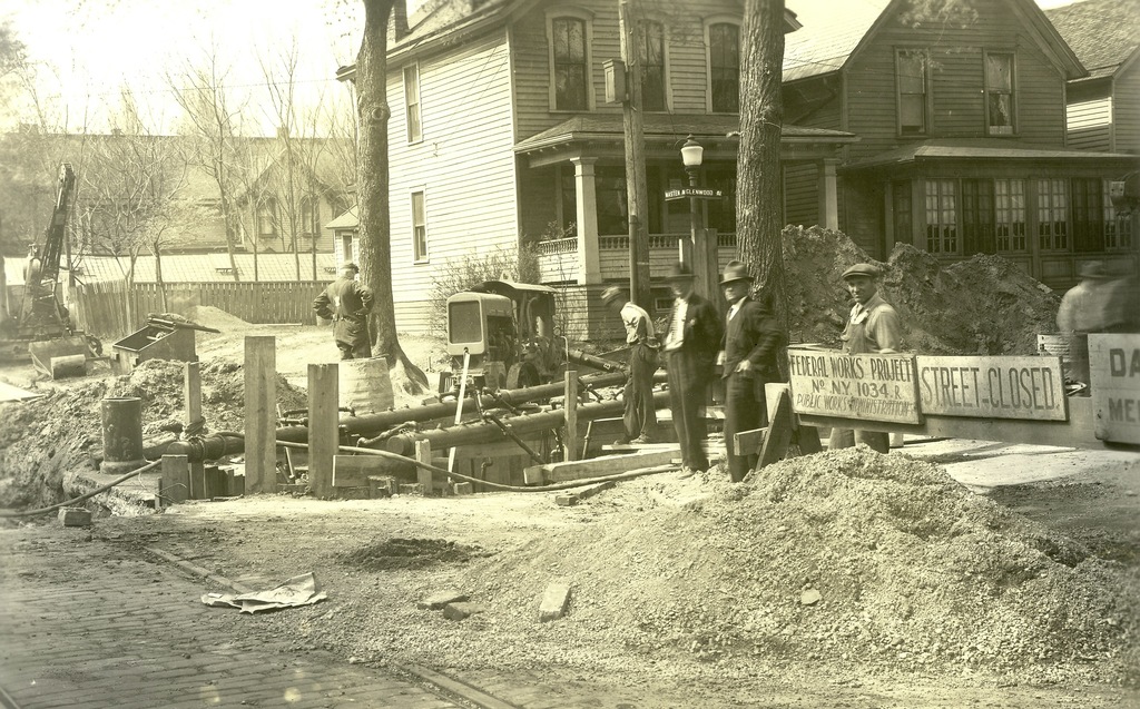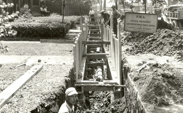 Large amounts of New Deal money were not spent in Buffalo until about 1935, but between that year and 1937 over $45 million had been spent, employing over 75,000 people. By far the largest single expenditure in the PWA relief money allocated to Buffalo was for the construction of a new sewer. The photo collection of the Western New York Heritage Press contains a large number of photographs, documenting this 15-million-dollar project. One may argue that there is nothing aesthetically pleasing about pictures of sewer work. In their efforts to document the project, however, the photographers also captured images of city streets lined with beautiful elms before Dutch Elm disease wiped them out. Also appearing are countless other details; vintage automobiles, machinery and advertisements, shops long since closed and candid moments of Buffalo citizens going about their daily lives.